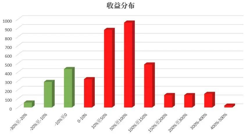 從中我們可以看到,獲得極高與極低收益次數(shù)的機(jī)會(huì)都比較少,最多的收益區(qū)間還是落在50%-100%當(dāng)中,而平均收益率68.55%也在這一區(qū)間之中。其實(shí),只要采用持有這一簡(jiǎn)單的行為,大概率上我們會(huì)獲得一個(gè)還不錯(cuò)的收益。