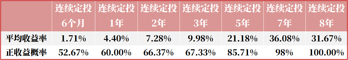 看似簡(jiǎn)單的定投,想要成功,最重要的就是耐心和時(shí)間。我們也拿過(guò)去的數(shù)據(jù)做了一些回測(cè),比如中證偏股型基金指數(shù)為例,就發(fā)現(xiàn),隨著定投時(shí)間的周期越長(zhǎng),獲得正收益的概率也就越高,對(duì)于市場(chǎng)先生短期帶來(lái)的風(fēng)險(xiǎn),確實(shí)有較好的平滑作用。