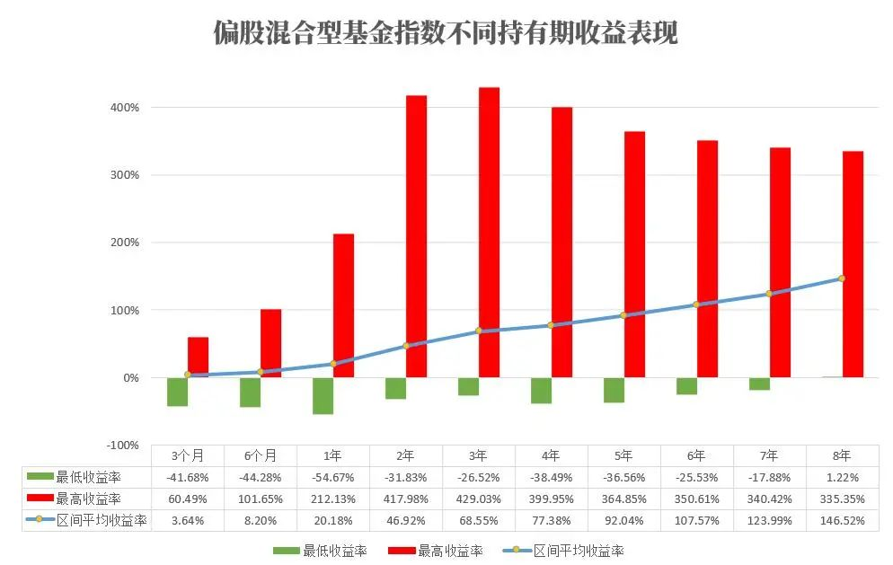 除了提升正收益的概率,我們投資基金自然也希望獲得更好的收益體驗。我們?nèi)砸云苫旌闲突鹬笖?shù)(Wind代碼:885001.WI)為例,統(tǒng)計從指數(shù)設立開始至2022年底近20年的數(shù)據(jù),任意一天內(nèi)買入該指數(shù),分別持有3個月、6個月、1年、2年、3年、5年、6年、7年、8年的平均收益率。